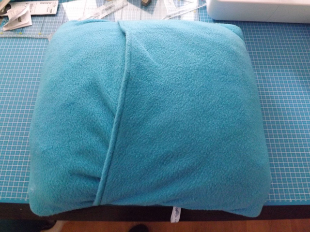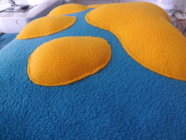 Coussin en polaire bleu clair et motif de patte en relief jaune, rembourrage fourni (deuxième coussin à l'intérieur, rempli de chutes de polaire).